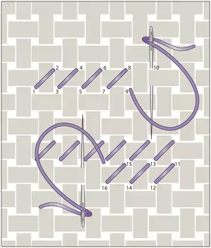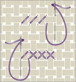 Complétez la rangée. La rangée retour se brode de droite à gauche, en faisant des croix avec l’aiguille en haut en 9, en bas en 10, en haut en 11 et en bas en 12. Complétez la rangée retour et répétez la séquence de broderie jusqu’à ce que la zone brodée corresponde au diagramme.