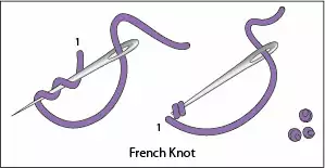 Tirez doucement sur le fil de sorte que les fils enroulés restent serrés et soient maintenus tendus, insérez l’aiguille à côté du 1. Tirez le fil à travers l’envers jusqu’à ce que le nœud se forme et se trouve solidement placé. Un point en gras sur le diagramme indique qu’un point de nœud est nécessaire.