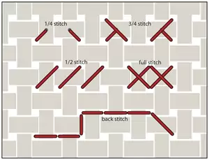 Certains artistes utilisent des demi points parfois pour ajouter des ombres ou de la profondeur au dessin au point de croix. Pour broder un demi point, amenez l’aiguille de l’envers en haut à 1, et en bas en 2. En haut en 3, en bas à 4.