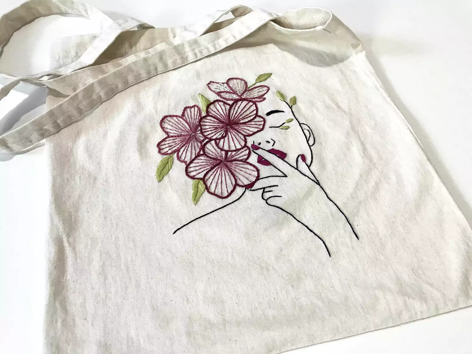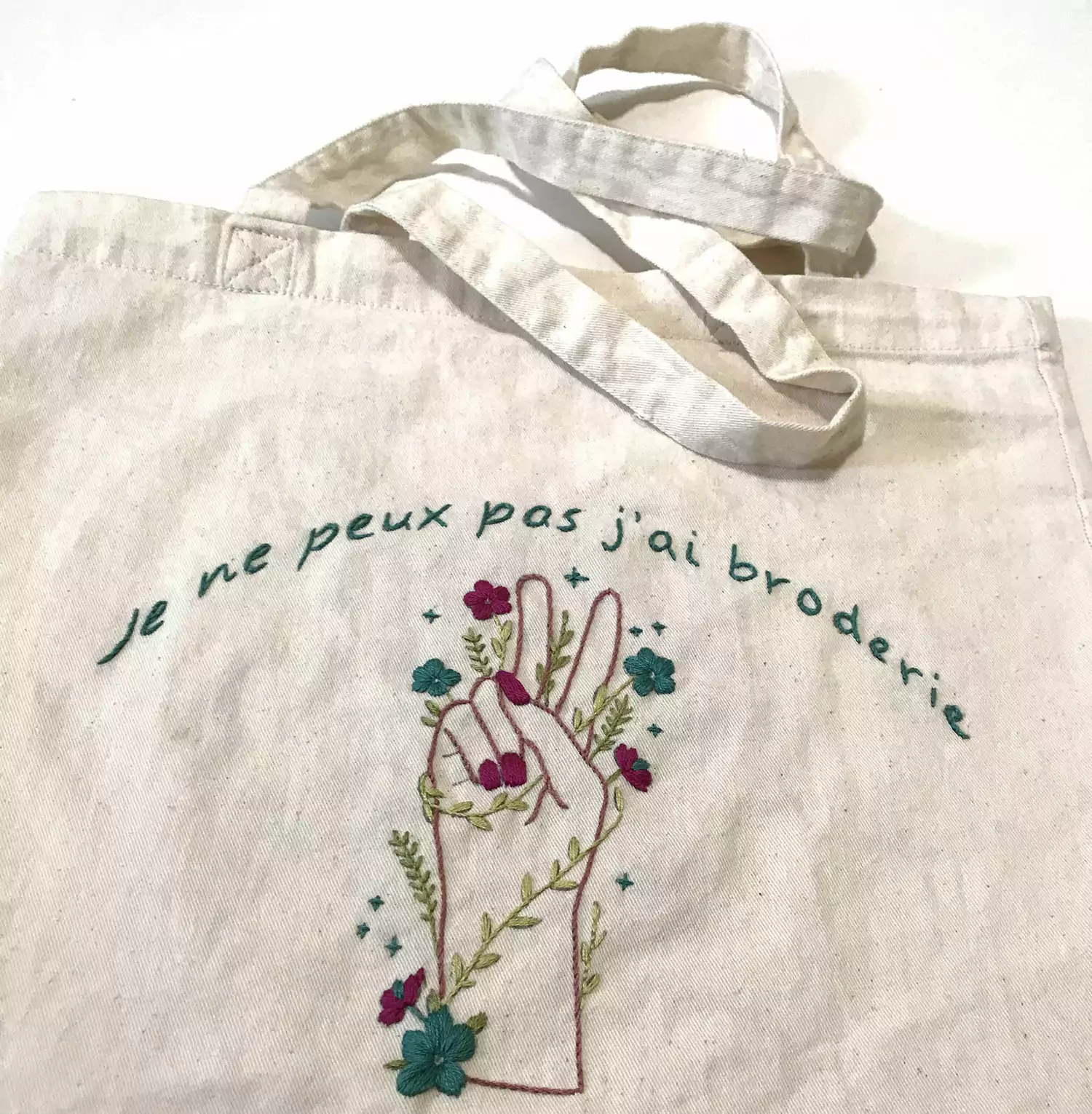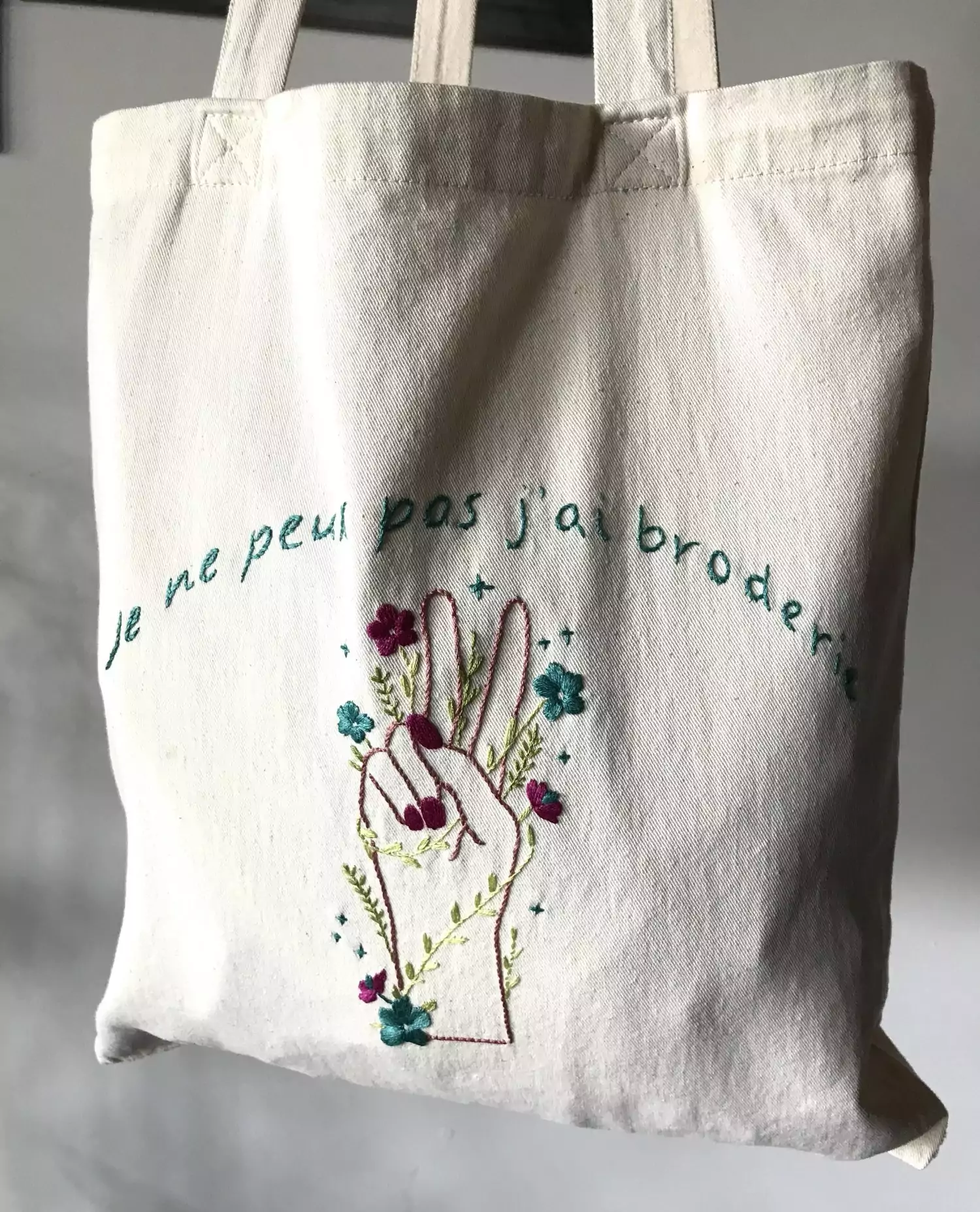 Des kits complets comme celui-ci qui contiendront le modèle à broder et le tote bag (sac) qui vous servira de support.